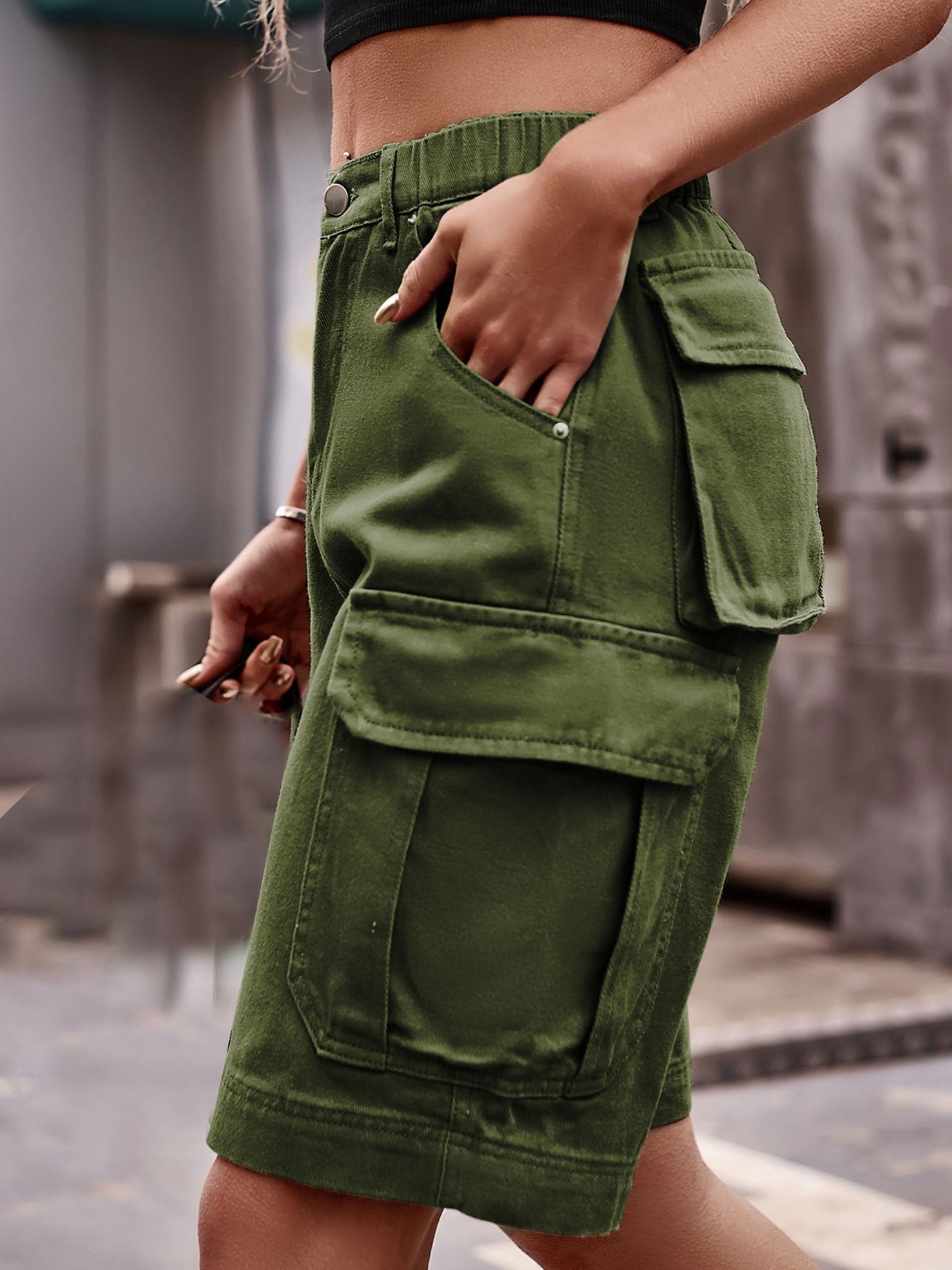 Army Green Cargo Denim Shorts, Flap Pockets Straight Legs Elastic Waist Short Denim Pants, Kpop & Y2K Style, Women's Denim Jeans & Clothing