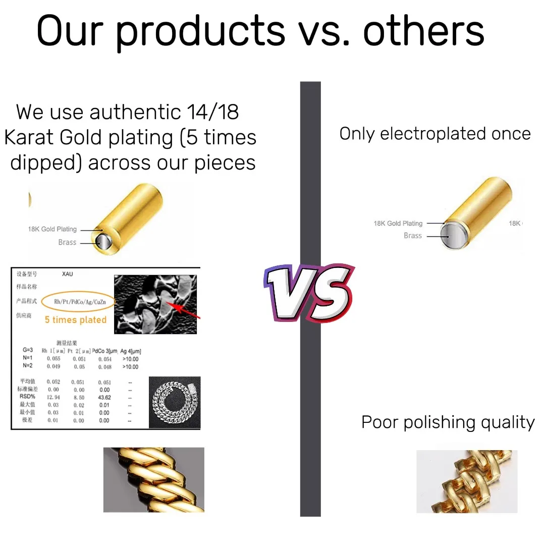 This Cuban link chain is crafted from brass, not cheap stainless steel(The value of brass is 2.5 times that of stainless steel) .As is well known, stainless steel contains nickel, but our Cuban chain is environmentally friendly.It is Lead(Pb)-free, Cadmium(Cd)-free, Nickel-free, and hypoallergenic.No need to worry about health issues such as skin allergies.