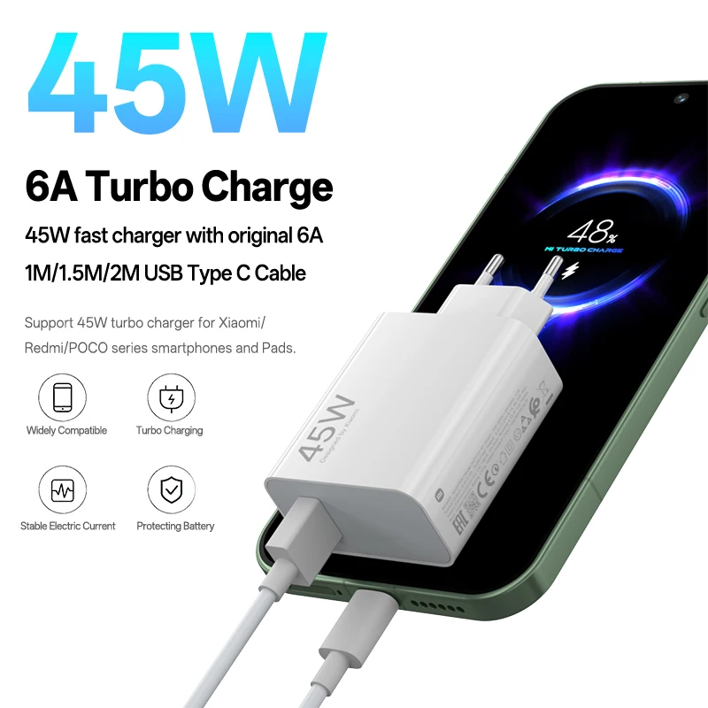 45W USB Turbo Fast Charger EU Plug Wall Charger Power Adapter with Original 6A USB Type C Turbo Fast Charging Cable 1M/1.5M/2M for Xiaomi /Redmi/ POCO Smartphones and Tablets.