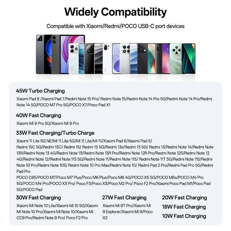 √ Widely Compatibility: 45W turbo charger for Xiaomi/Redmi/POCO series 45W/40W/ 33W/ 30W/ 27W/ 20W/ 18W/ 10W smartphones and Pads.